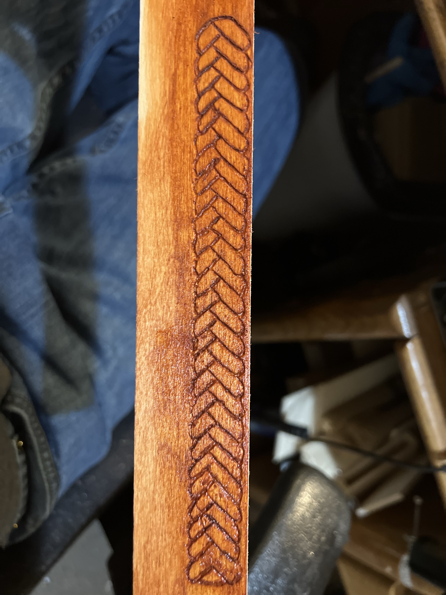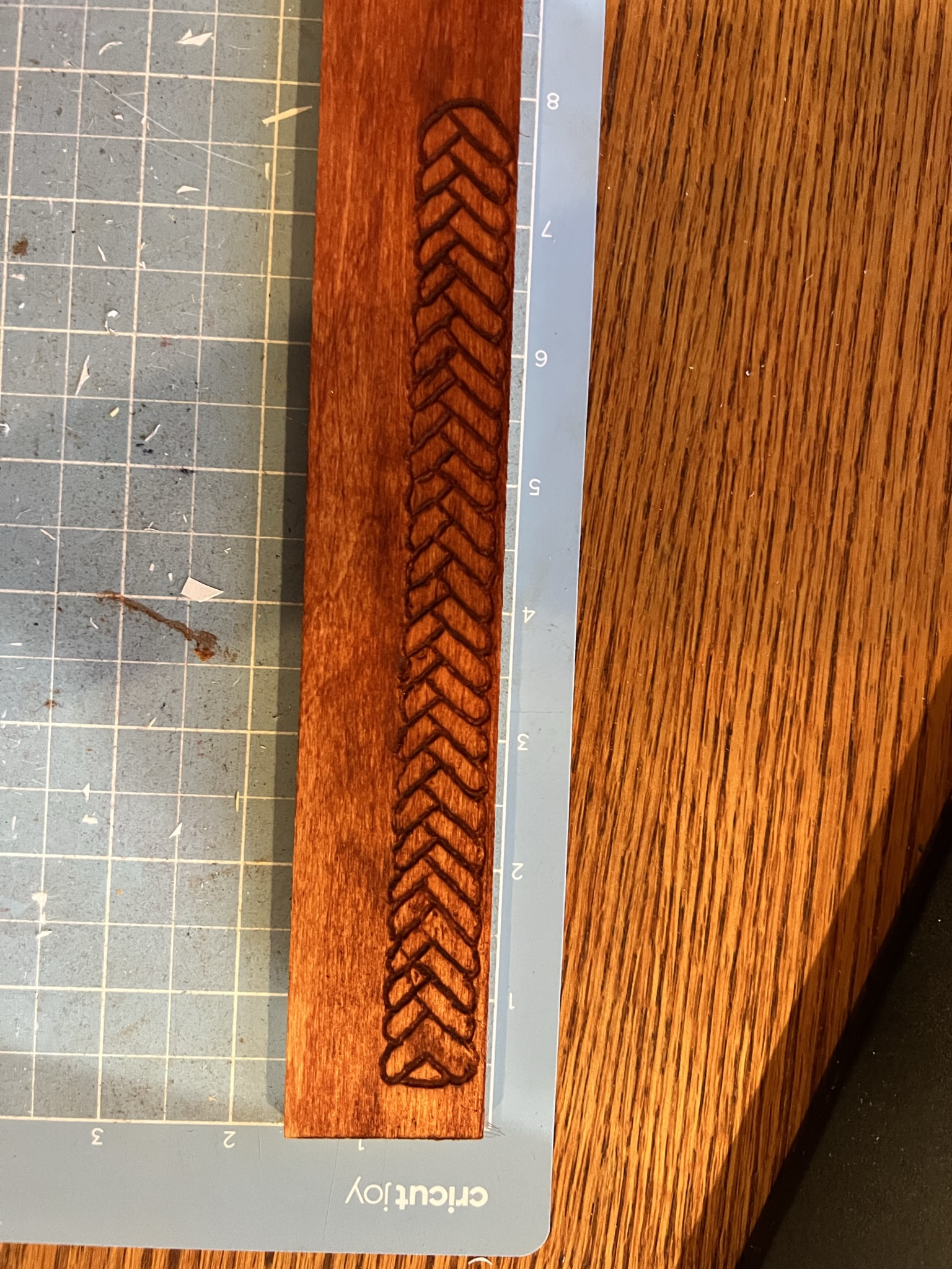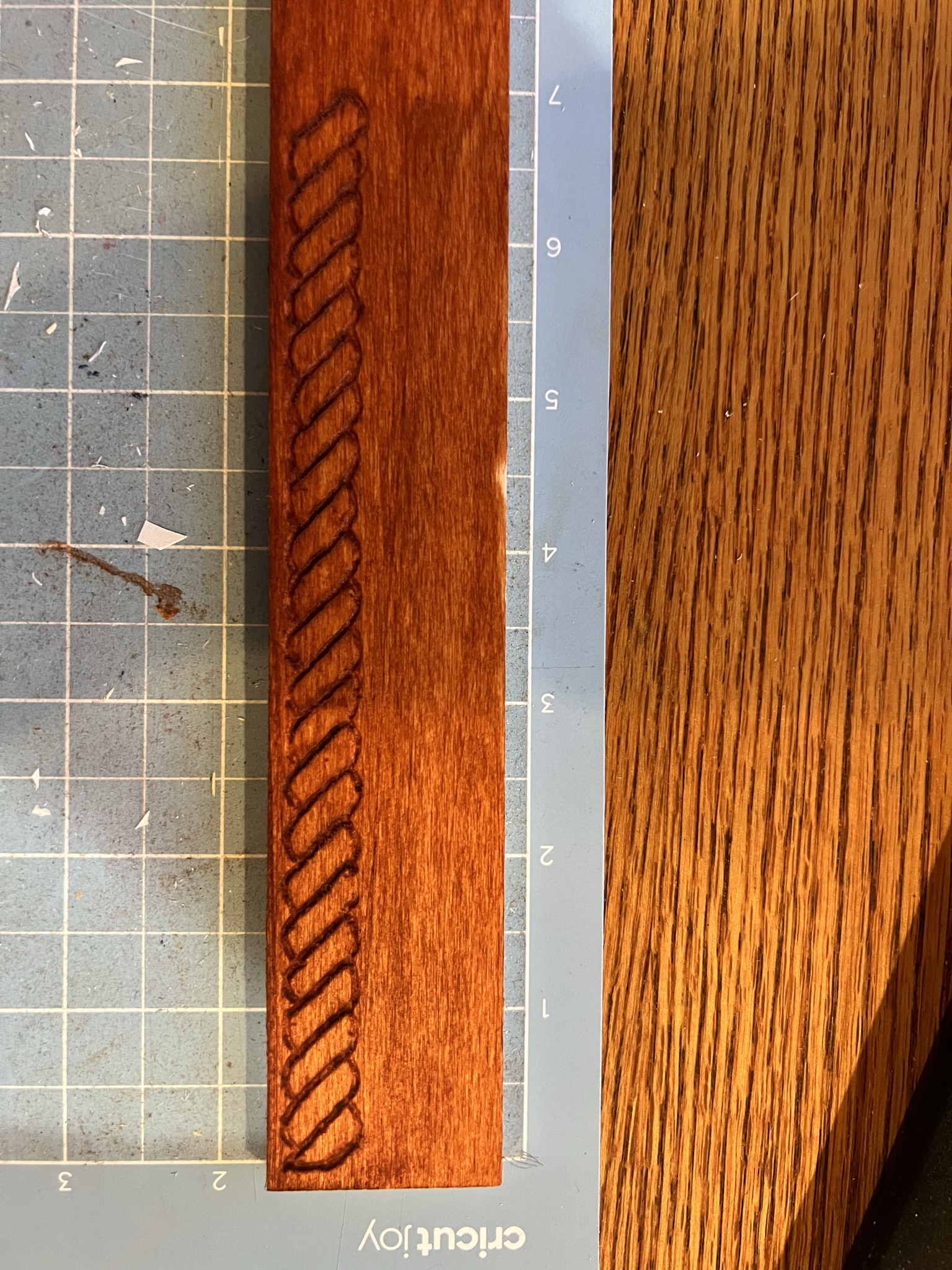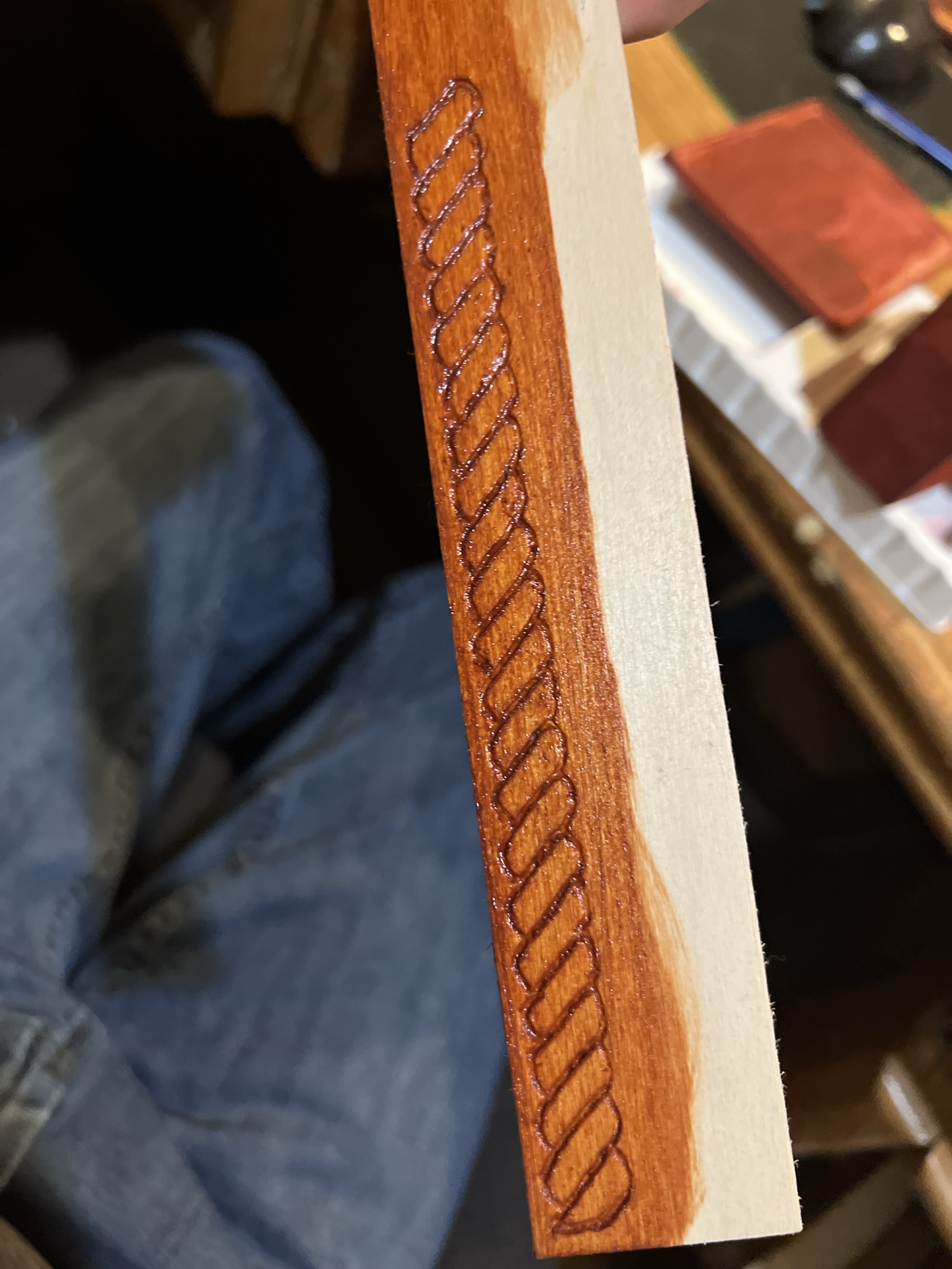 The outside, however, was/is entirely up to me, and so I’m testing a few different engraving/embossing ideas to stretch my skills out a little. I did two twisted-rope style engravings on basswood, one as a single wound piece of rope, and a second that was supposed to look like two+ ropes somewhat braided. It still looks cool, like stacked seashells, but not quite what I was hoping.