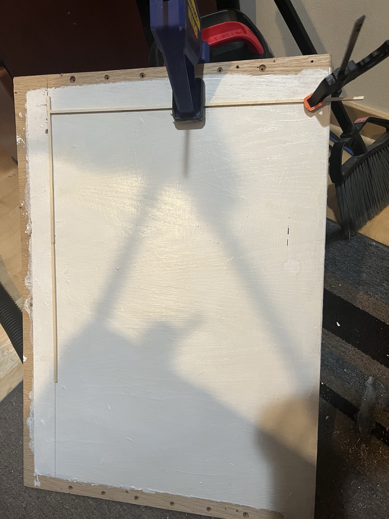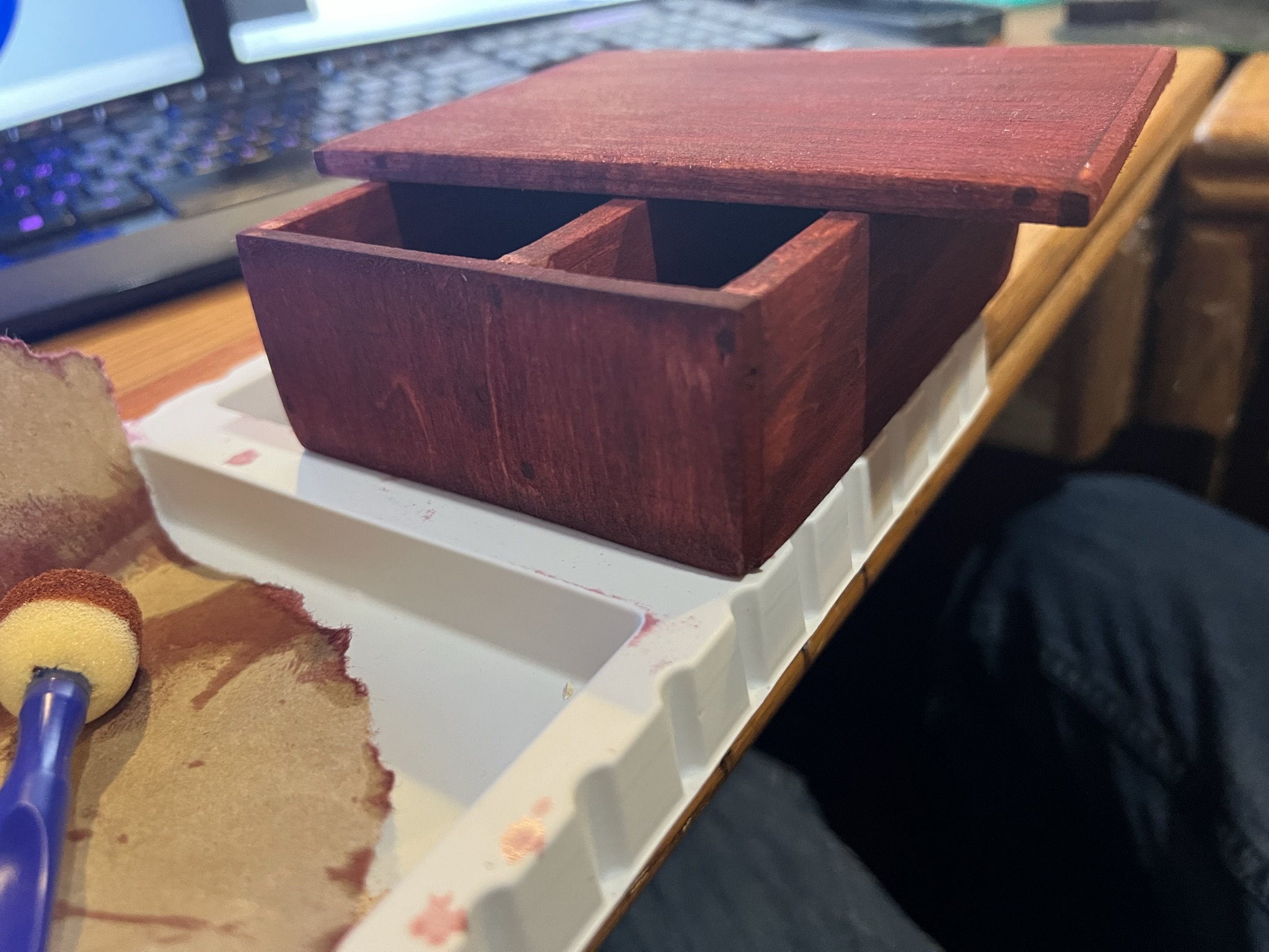 Starting off my (hopefully) brief update with a single session project, a paintbrush holder. I had some scrap stock, and the container I used to hold clean brushes was due for replacement. As Alec Steele says, “When you need a tool, make a tool.”, and so I did. It’s not my best work, but I made it in about an hour, not counting the top coat (had to let the paint dry.)