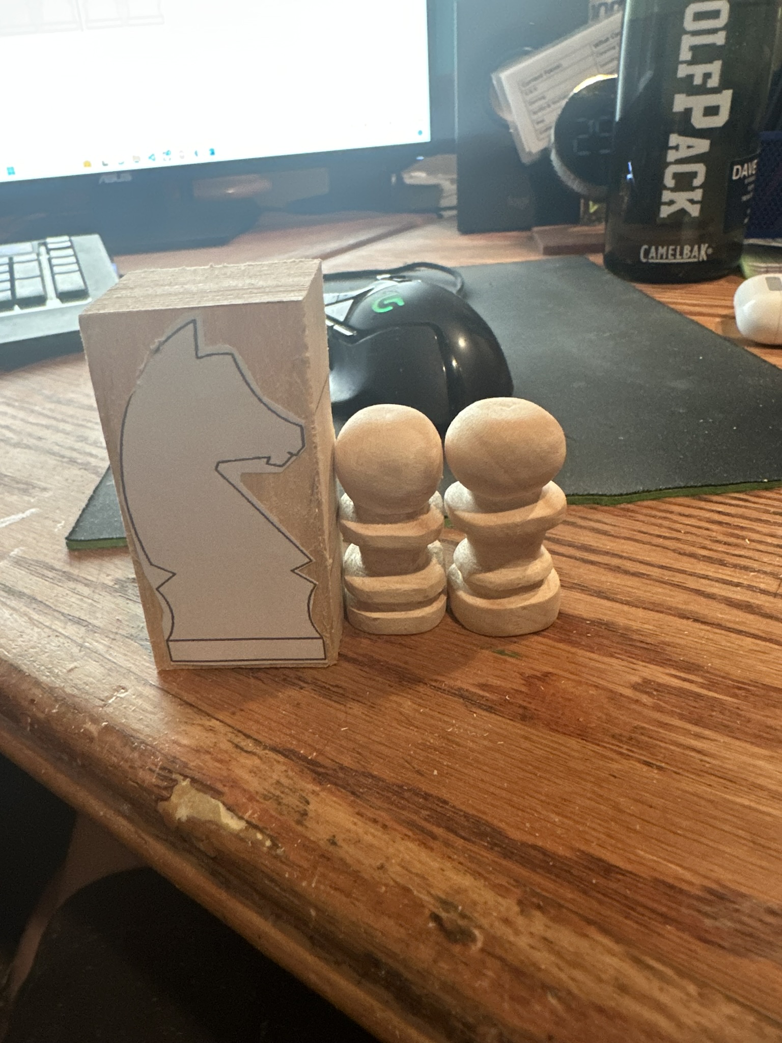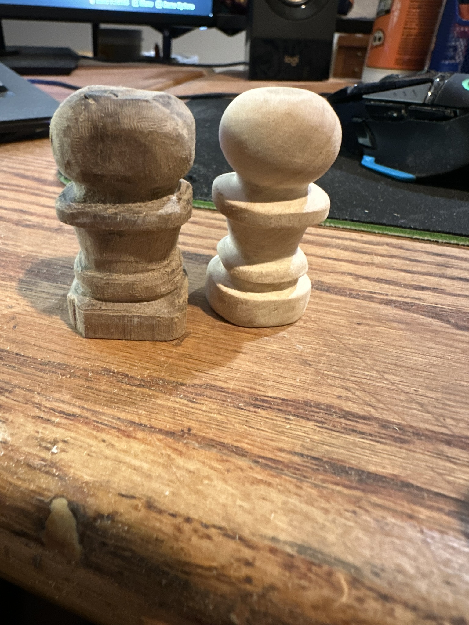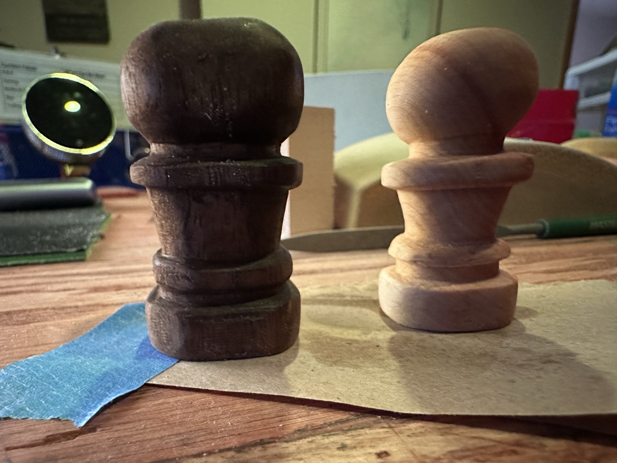 • A second pawn has been completed to a rough finish. I keep forgetting how difficult black walnut is to work with compared to basswood. It feels like I’m trying to file down a stone!