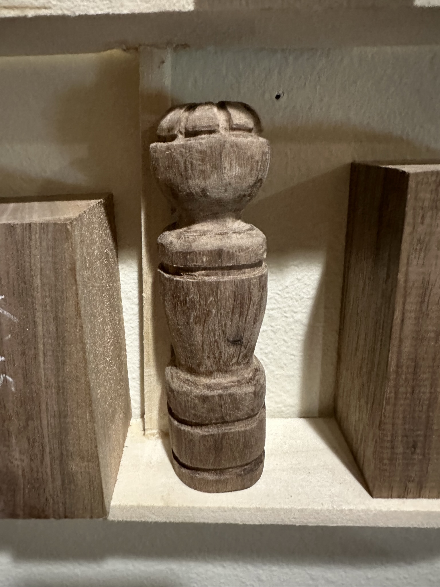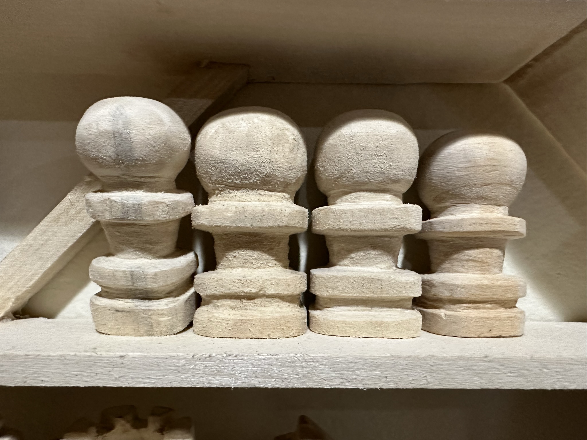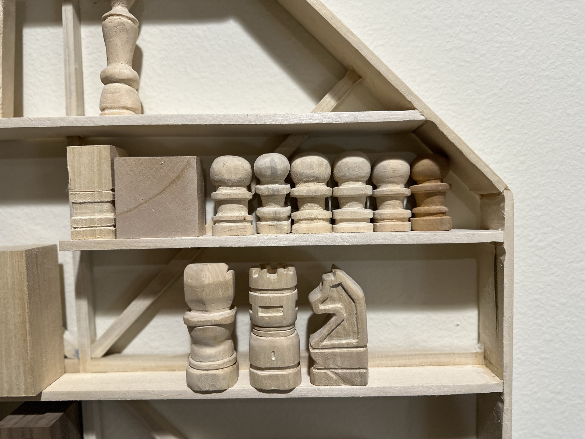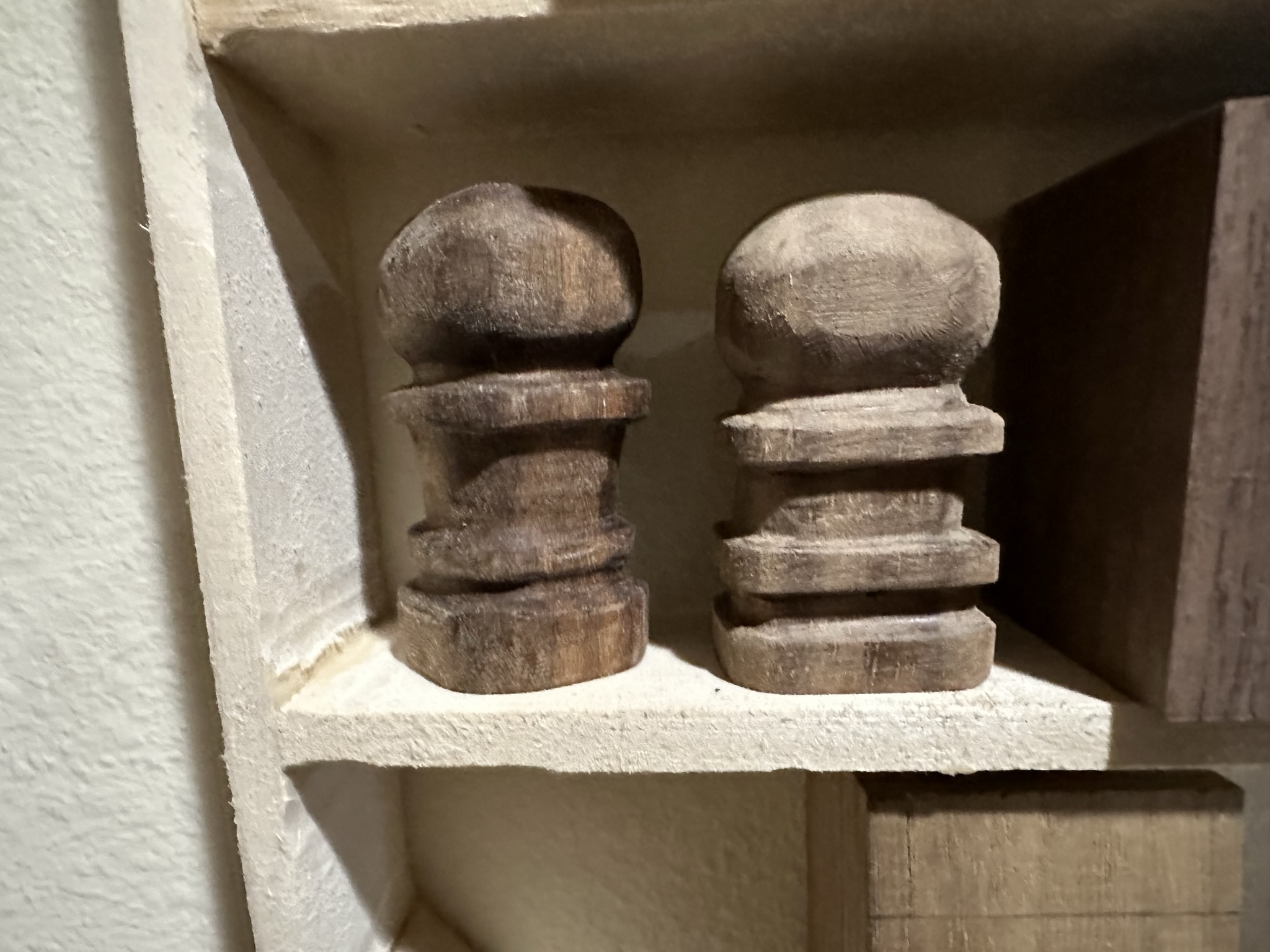 • A second pawn has been completed to a rough finish. I keep forgetting how difficult black walnut is to work with compared to basswood. It feels like I’m trying to file down a stone!