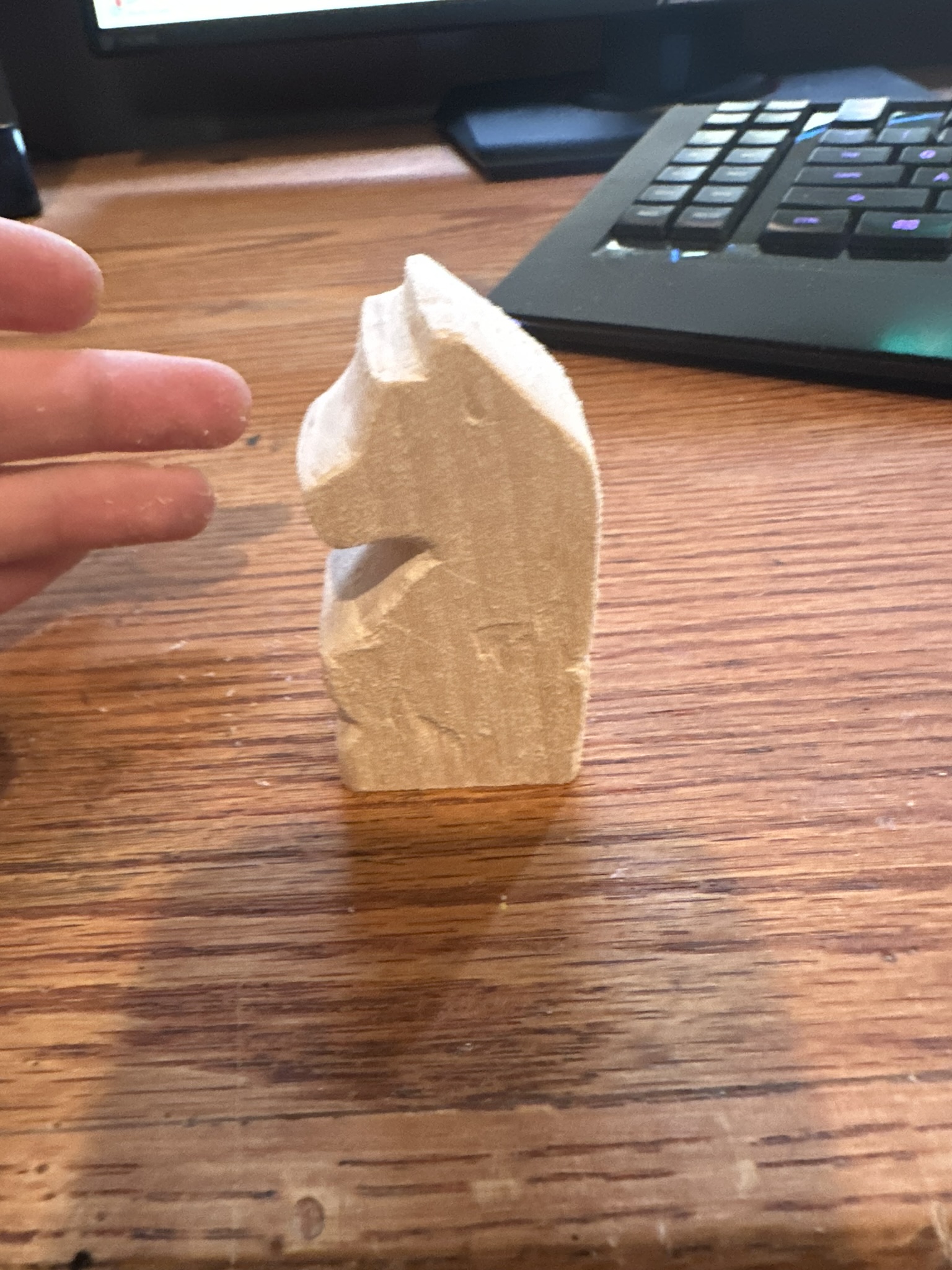 • I’m earnestly surprised how uniform the pawns look. I laminated a template for the regions I need to remove material from so I can mark it before I start working, but I’ve had a few chips break off. Yesterday I had a one of my whittling blades get away from me and it got me in the left index finger pretty bad. No stitches, but it makes opening doors difficult.