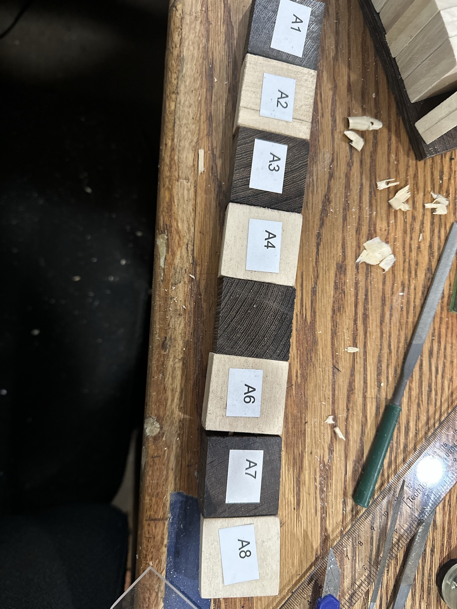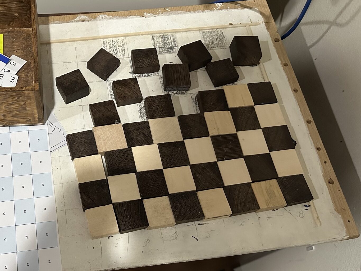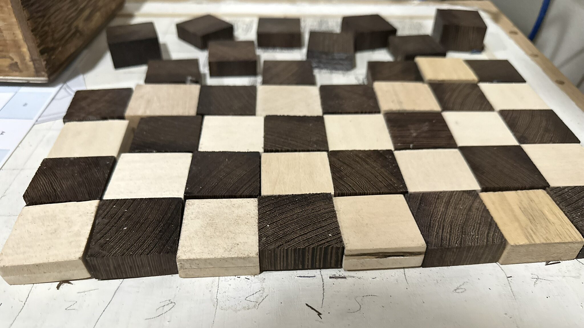 The wenge (darker pieces) is cut to 1.5″ x 1.5″, but I didn’t have quite enough. One of the four 10″ pieces ended up being unusable. Wenge is a very brittle wood when it’s thin, as well as very dense, which makes it difficult to cut by hand. I attempted to size the blocks down by hand and even with a miter box clamped into my workbench, I skewed by 1/4″ into the cut and the twist was bad enough it was unrecoverable. I have more than half (19) of the white squares done, I’m using basswood I sourced from my grandma’s neighbor/brother-in-law. All the of basswood pieces are used from the same family-sourced basswood!