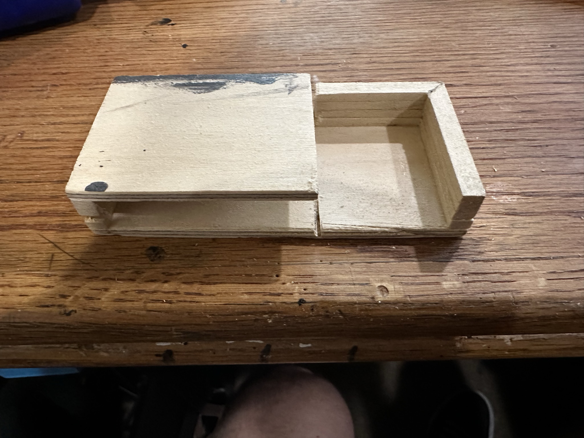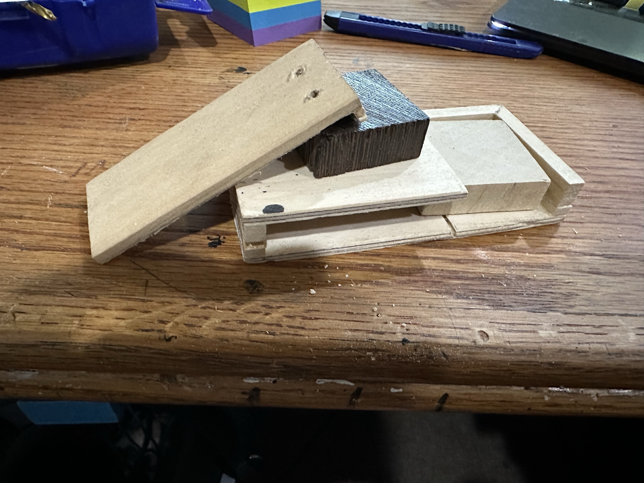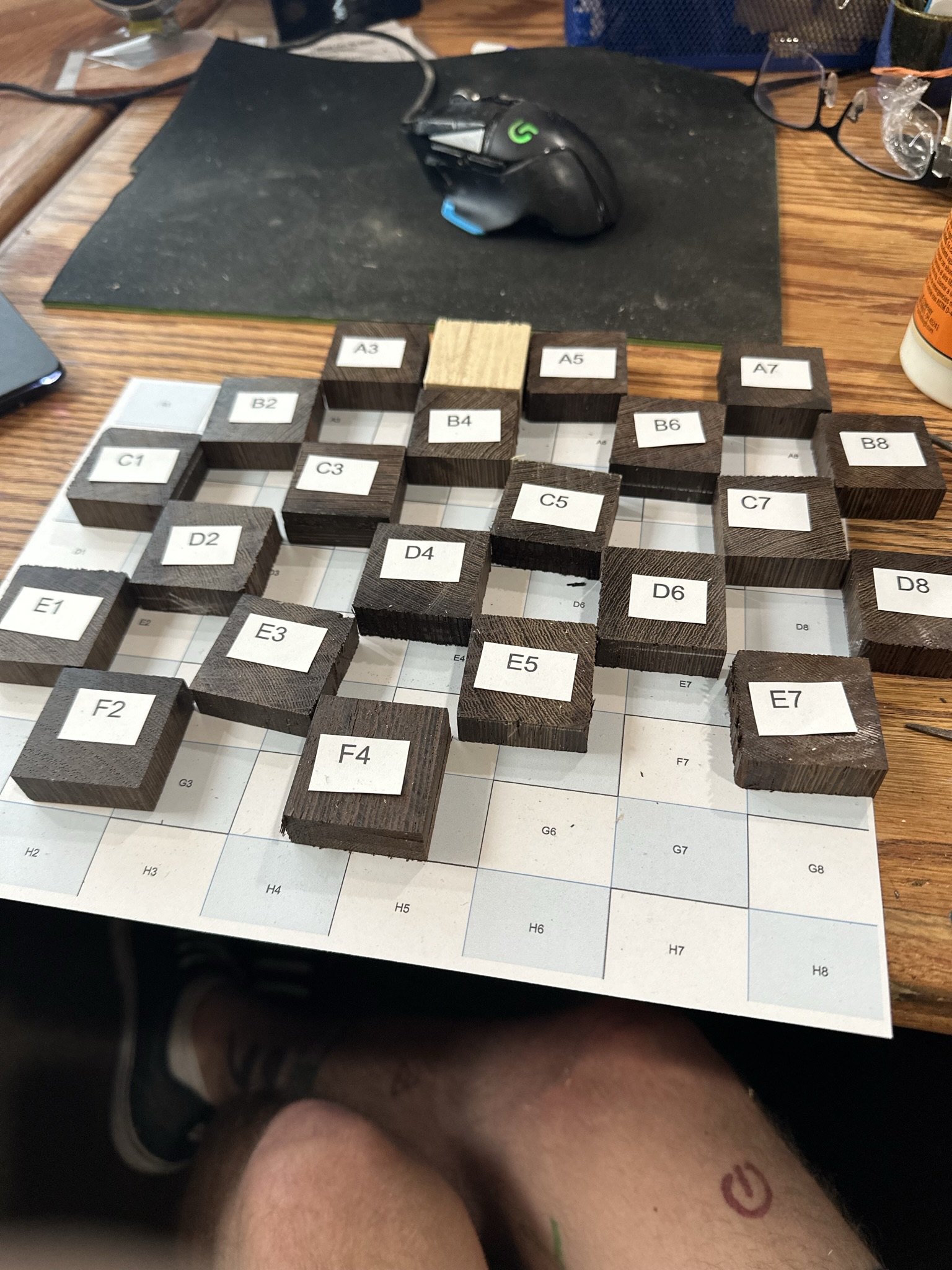 The wenge (darker pieces) is cut to 1.5″ x 1.5″, but I didn’t have quite enough. One of the four 10″ pieces ended up being unusable. Wenge is a very brittle wood when it’s thin, as well as very dense, which makes it difficult to cut by hand. I attempted to size the blocks down by hand and even with a miter box clamped into my workbench, I skewed by 1/4″ into the cut and the twist was bad enough it was unrecoverable. I have more than half (19) of the white squares done, I’m using basswood I sourced from my grandma’s neighbor/brother-in-law. All the of basswood pieces are used from the same family-sourced basswood!