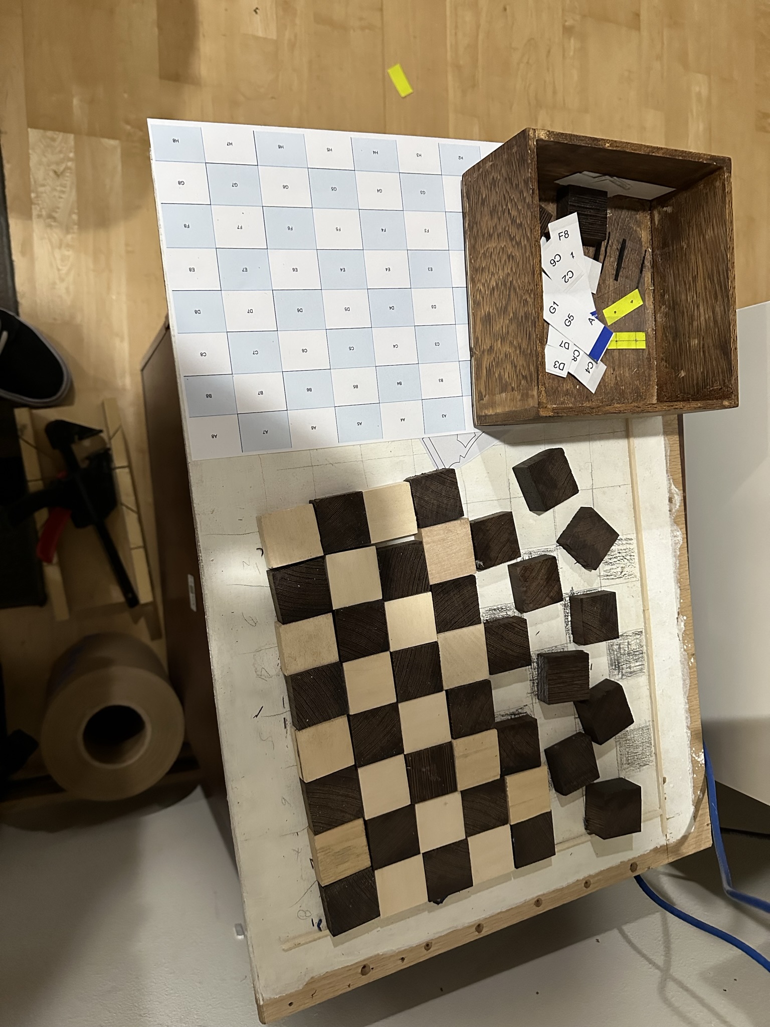 • I made a jig for drilling the pinholes and for cutting the board squares.