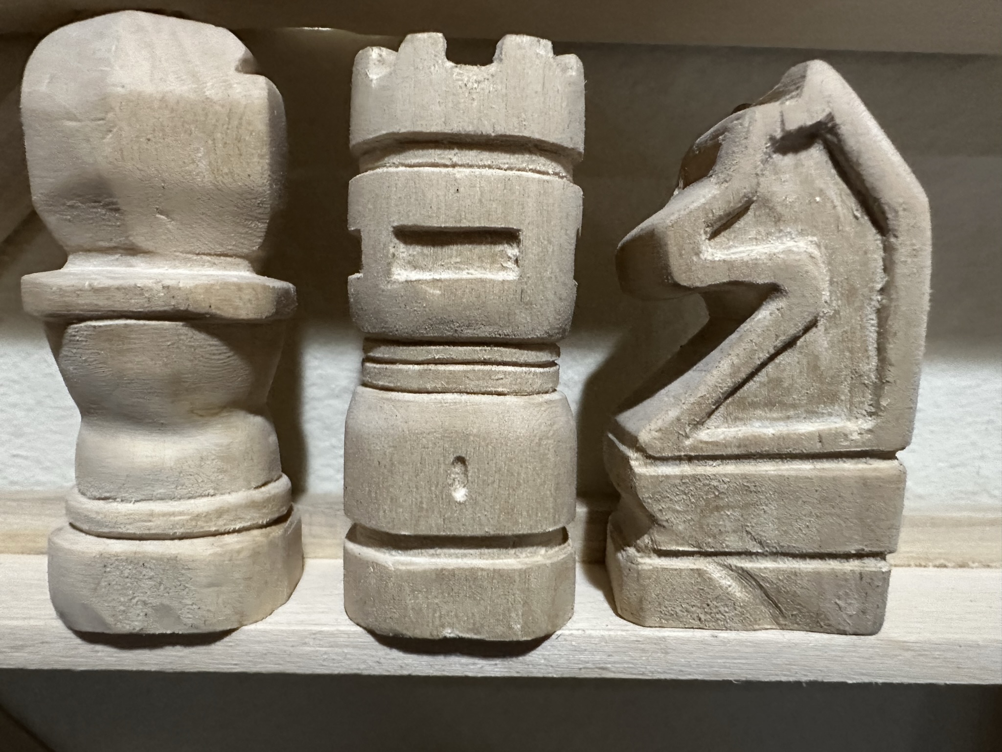 • Half of the white pieces are done and finished to a 600 grit. I’m trashing the white queen and redoing it.