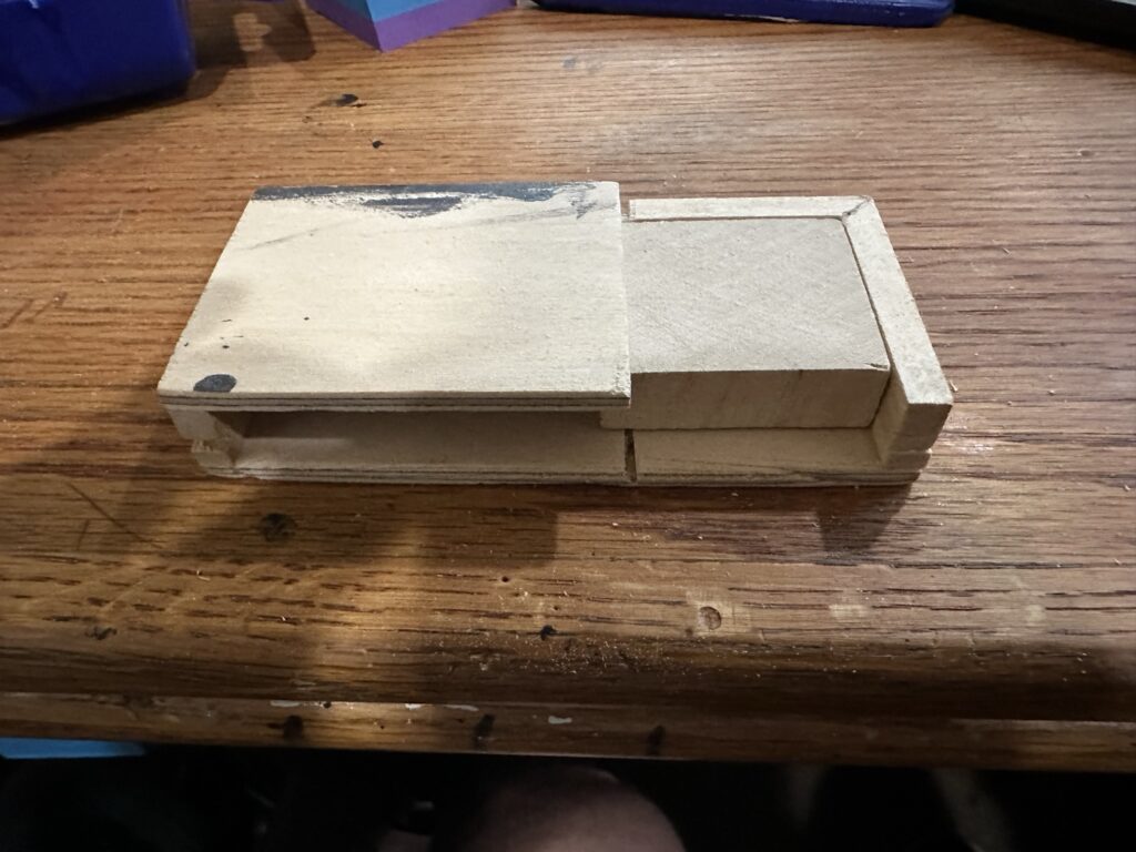 Staying on topic, I found that once pieces are cut to 1/2″ slices, they’re difficult to hold while in a miter box to cut to 1.5″ x 1.5″. Rather than skew my cuts or end up sanding all day, I made a 3/4 enclosed jig to hold the slice in place and guide the blade to 1.5″ exactly.