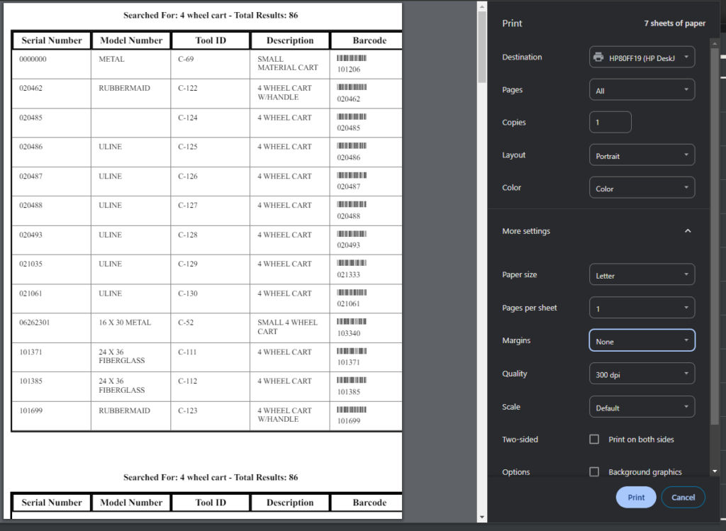 It was reported during the development of the project that being able to print a list of tools left at jobsite was essential functionality. The shop staff would print a list of the items left to be returned, provide that list to a shop staff member with a barcode scanner, and send them to go look for the rest of the assets that needed to be recovered.